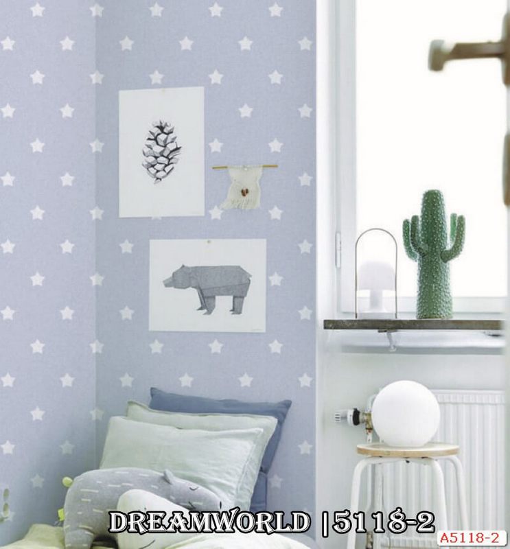 Phối cảnh 3D mẫu giấy dán tường phòng ngủ Hàn Quốc họa tiết hình sao nền xanh đẹp cho phòng bé