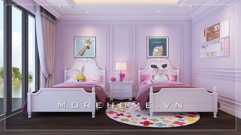 Mẫu thiết kế nội thất phòng ngủ con gái thể hiện được sự nhẹ nhàng và trang trí bởi giấy dán tường màu tím một điểm đặc biệt của phòng con.