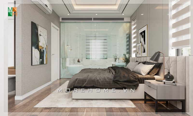 Không gian sống trong phòng ngủ được trang trí bằng nệm ốp tường bọc nỉ màu be giúp tạo nên một không gian tinh tế, thanh lịch và cá tính, cung cấp cho người dùng sự tiện nghi hiện đại.