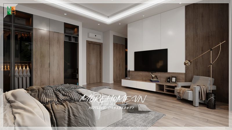 Phòng ngủ được thiết kế với bàn làm việc và nội thất gỗ tự nhiên sơn trắng, tạo nên một phong cách đương đại và sang trọng.