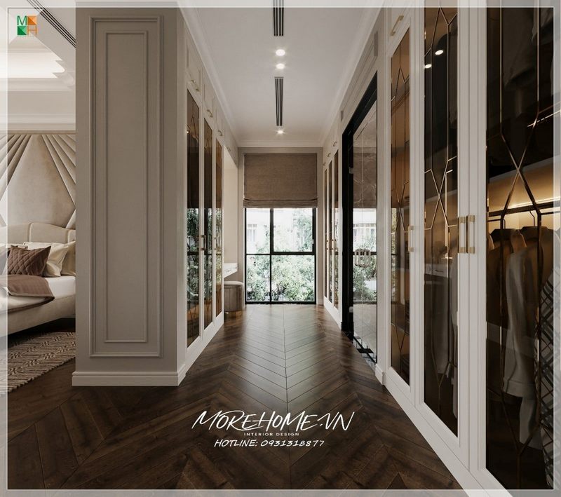 Mẫu thiết kế phòng thay đồ của phòng ngủ được trang bị hệ thống tủ quần áo cánh kính kịch trần lớn, giúp bạn có nhiều không gian để lưu trữ đồ dùng.